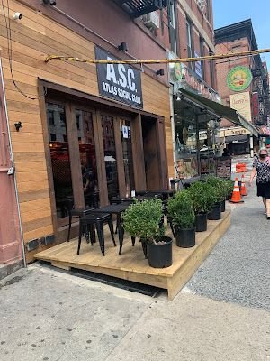 The bouncer needs to cut down on the steroids...he's not normal. We were headed to dinner on 9th ave...it was raining and decided to pop into one of the bars for a drink or two to wait out the rain. Literally stepped inside the door, pause for the amount of time to pull out my phone, open it and start to double check location of restaurant and the bouncer was like "keep it moving!" Now, it's hard to convey how rude it felt...but it was rude...and weird...and not necessary. So I said "yeah...we'll keep it moving...right back out of the bar and to one of the 10 or so other gay bars within a couple blocks". Went to Flaming Saddles...greeted by a smiling, friendly bartender...had a great time...after 2 drinks each and a generous tip...off to our dinner...will NEVER EVER go to Atlas Social Club...nice job dude...you are weird...