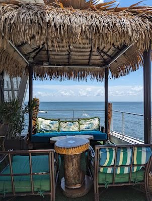 Sitting up on the roof overlooking the water and St Petersburg is this cute little tiki bar. We came on a Saturday around 12:00 and were able to get a spot at the bar. Shortly after the place became packed. The bartender was great- she recommended drinks and food. The mango salsa with chips was the best we have had. We also got the wings and smash burger. Wings were good- but veggies with them were two celery and two soggy carrots. There is no tipping here as they add a 20% service fee that goes to the employees. Being a former server I did like this as it is Hard to make a living on a tipping system, especially in a tourist area.