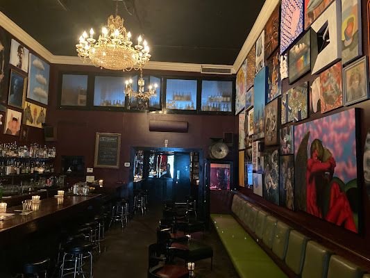 Dozens of paintings hang on the walls at this local hangout with signature drinks & bar snacks.