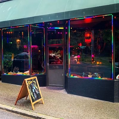 This is definitely a locals bar. With unique charm. Comfortable used furniture and felt art. And a cacophony of color coming from strips of light. Go upstairs to play a board game The owner is super nice, so you be to. Excellent drink some snack stuff but no real food. No matter my favorite place to visit when in Seattle.